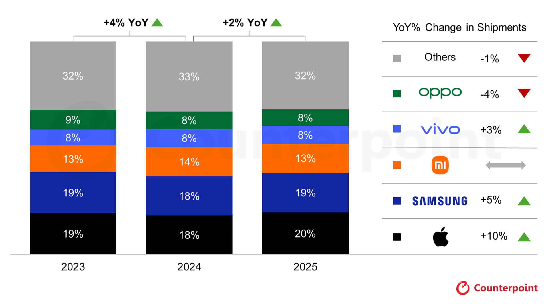 今回Counter Pointが2025年通期のメーカー別シェアを公開していることが判明したとしています。まず全体でみた場合に前年対比で2%も出荷台数が増えていることを確認することが出来ます。