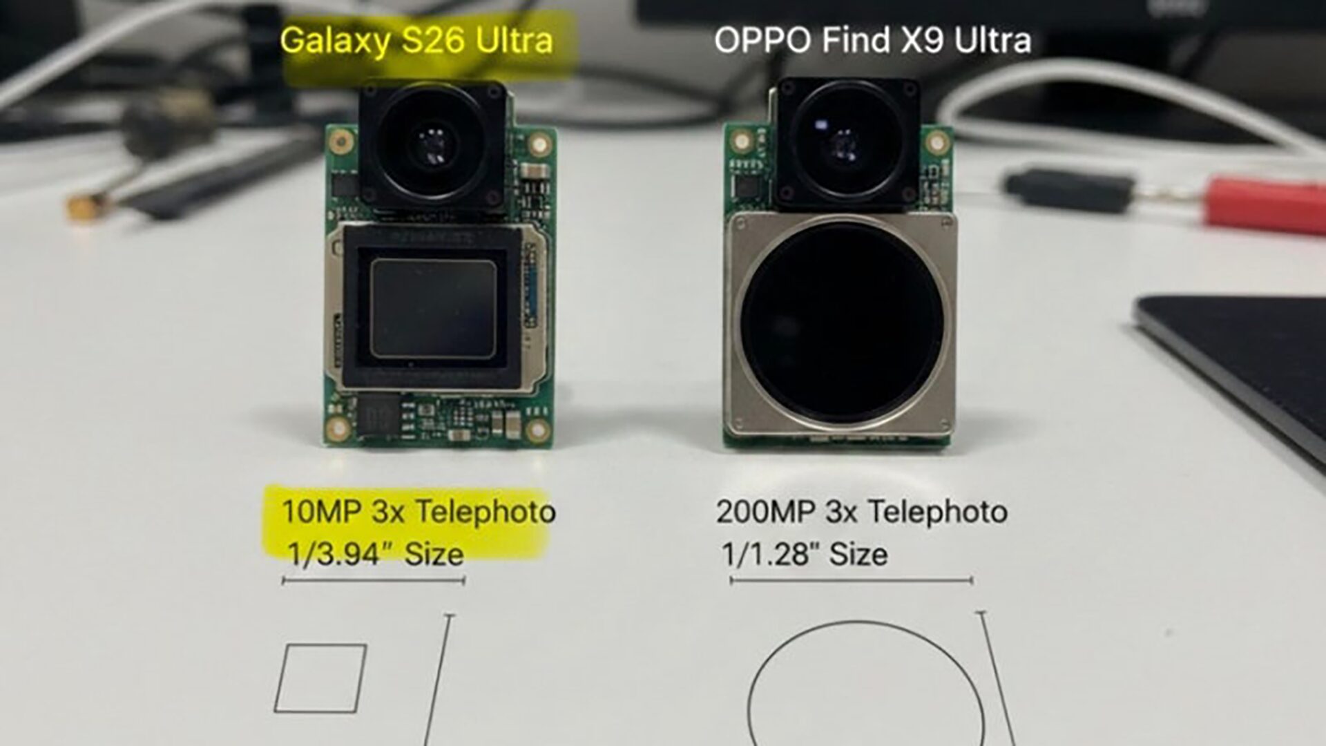 Samsung Galaxy S26 Ultra の10MP・3倍ズーム・1/3.94インチの望遠センサーと、OPPO Find X9 Ultra の200MP・3倍ズーム・1/1.28インチの望遠センサーのサイズ比較です。